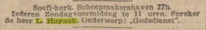 Op 9 december spreekt Louis Salamat Hoyack in het Centrum Rotterdam over het onderwerp  ‘Godsdienst’. Blijkbaar heeft het centrum op dat moment een ruimte beschikbaar op het adres Scheepmakershaven 27b. Tijdens het bombardement op Rotterdam in de oorlog is de oudbouw van deze straat verloren gegaan.