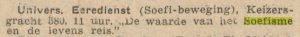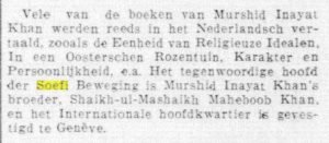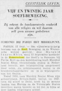In de Telegraaf van 11 september verschijnt een uitgebreid artikel ter gelegenheid van het 25-jarig bestaan van de Soefi Beweging. Er is hierbij gerekend vanaf de aankomst van Hazrat Inayat Khan in de Verenigde Staten in september 1910. De frase “werd 13 september herdacht” in de eerste alinea van het artikel moet eigenlijk zijn “wordt 13 september herdacht” gezien de datum van het artikel en die van het verschijnen van de krant.