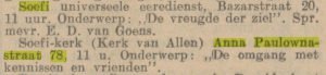 Ekbal Dawla van Goens, de moeder van Shadbi van Goens en schoonmoeder van Maheboob Khan spreekt op zondag 24 februari in het Haagse centrum van de Bazarstraat 20. Ook in de Anna Paulownastraat 78 wordt een Universele Eredienst gehouden in de ‘Kerk van Allen’, de groep van baron Van Tuyll van Serooskerken.