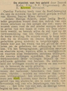 Op 27 juni besteed het Haagsch Dagblad aandacht aan het verschijnen van een werk van Inayat Khan: ‘De mystiek van het geluid’. Het is een Nederlandse vertaling door Carolus Verhulst van het boek ‘The Mysticism of Sound’ dat in 1923 verscheen.