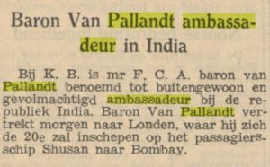 Van 1950 tot 1952 was Huzurnavaz van Pallandt ambassadeur in Moskou. In januari 1953 vertrekt hij naar Delhi, India voor zijn nieuwe post als ambassadeur.