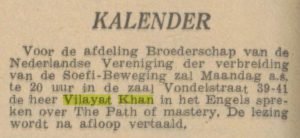 Op maandagavond 16 februari houdt de dan 37-jarige Vilayat Inayat Khan een lezing in Amsterdam in de het pand van de Vrijmetselarij in de Vondelstraat. De lezing is in het Engels. Een aantal jaren later zal het Amsterdamse centrum onder leiding van Salima van Braam in dit pand ook de Universele Erediensten gaan houden.