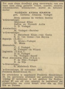 Op 22 november overlijdt Nurzadi Aysha Khanim (geboren C.J. Vodegel), de eerste vrouw van Mahmood Khan, vlak na de geboorte van haar dochter Aulia. Karimbakhsh Witteveen en Iman Kunst schrijven een In Memoriam in de Soefi Gedachte van december. De uitvaartdienst vindt plaats in de De Ruyterstraat 67, de locatie van de Zomerschool, waarna de teraardebestelling plaats vindt in het familiegraf op Oud Eik en Duinen.