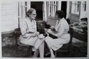 Lucy van Hoorn (l) en Shireen Smit – Kerbert (r) in gesprek tijdens de voorjaarsconferentie