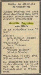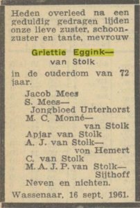 Op 16 september van dit jaar overlijdt Bhakti Eggink – van Stolk in de leeftijd van 72 jaar. Bhakti – Griettie is haar Nederlandse naam – is de zuster van Sirkar van Stolk. In het Algemeen Handelsblad van 19 september verschijnen twee rouwadvertenties, de eerste is van de kinderen en kleinkinderen en de tweede van de broers en zussen: