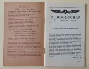 Op 27 en 28 mei is er weer een weekend van de Soefi Jongeren huize ‘Land en Bosch’ in ‘s-Graveland. Dr.R. van Brakell Buys houdt een lezing de mystiek van de Islam, ‘Van Gebodenleer tot Liefdeleer’. [1] Alim Vosteen heeft het secretariaat van de Sufi Youth Brotherhood overgenomen van A. Schilperoord.