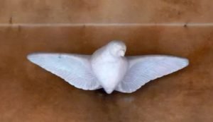 The head of the dove resting on its breast (heart chakra) as it is really ment by that specific “Eblem of the Messenger”, which symbolises the three prayers: Saum and Salat are the wings of the dove; and Khatum is the head of the dove, resting on its heart. That beautiful symbol of the resting on the heart, is obviously a reference to the “Zikar” as well as also being an illustration of Murshids most expressive words said in connection with the message: “ It is the cry of the Heart”.