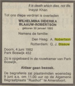 Op 4 juni overlijdt in Doorn op 89-jarige leeftijd Kafia Blaauw – Robertson, centrumleidster van Rotterdam. Twee jaar voor haar dood richtte ze een eigen branche op binnen de Soefi Beweging, de Tariqat Inayat. Na haar dood wordt deze tariqa geleid door Ramana Klaassen uit Hilversum en vanaf 2002 door Ameen Carp, die de tariqa omvormde tot een studiegroep die tot op de dag van vandaag bestaat.