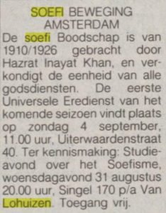 Op 4 september opent het nieuwe Soefi-seizoen in Amsterdam getuige een advertentie in dagblad Trouw van 31 augustus: