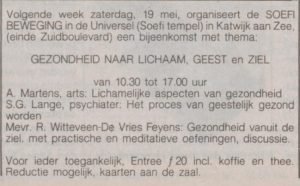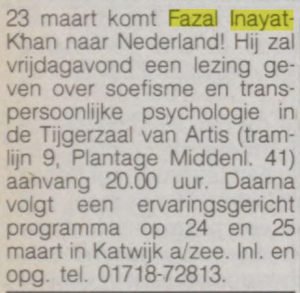 In het voorjaar komt Fazal Inayat-Khan naar ons land voor een lezing met aansluitend een weekend in Katwijk aan Zee. In het Parool van 10 maart vinden we de volgende aankondiging: