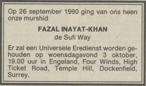 Londen 26 september. Fazal Inayat-Khan overlijdt om 8 uur in de ochtend in de leeftijd van 48 jaar aan de gevolgen van een hersenbloeding. Op 3 oktober word hij begraven na een Universele Eredienst die in de Khankah ‘Four Winds’ wordt gehouden. Bij de dienst zijn vele van zijn mureeds aanwezig. Verder wordt de dienst bijgewoond door zijn vader Hidayat, zijn broer Gayan, Karimbaksh Witteveen en Mahmood Khan. Karimbakhsh Witteveen schrijft een In Memoriam in de Soefi Gedachte van december 1990.